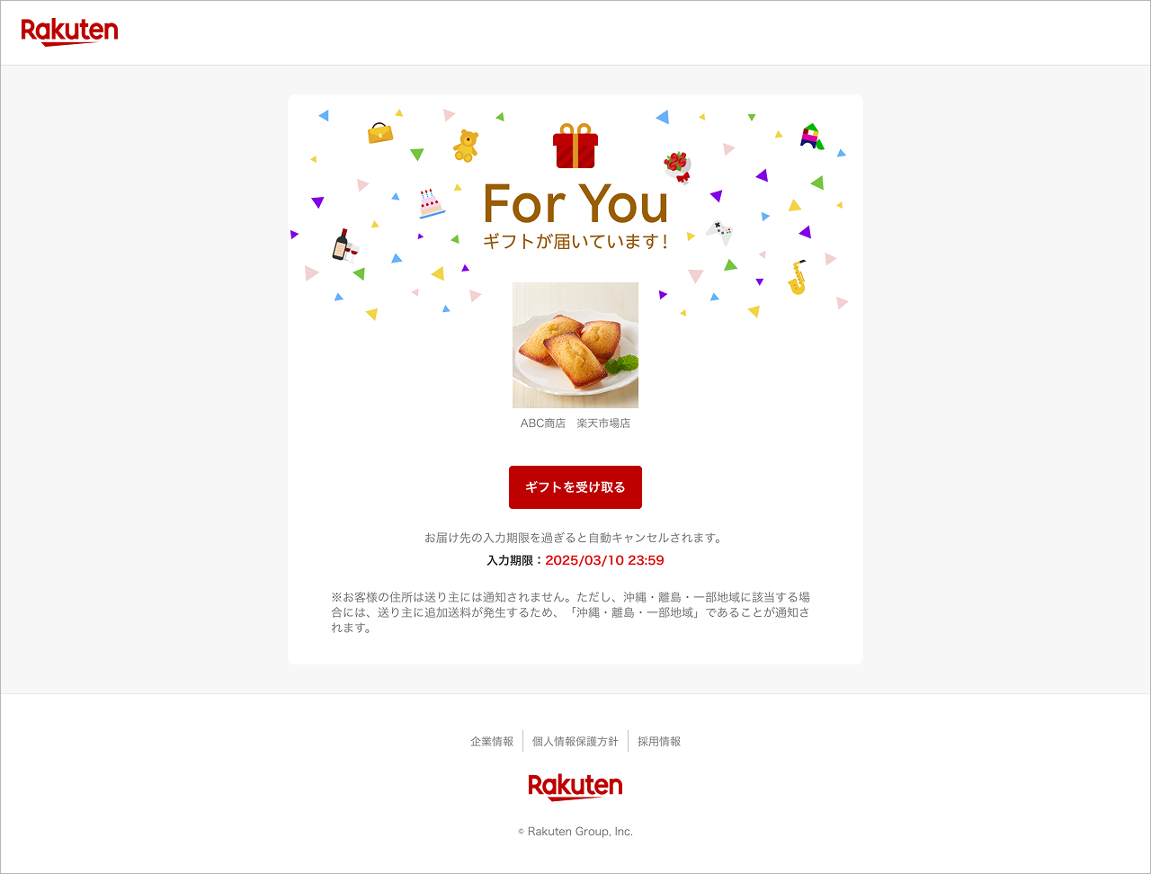 【楽天ソーシャルギフト】受け取る場合によくあるご質問受け取りについて ▼ギフトを受け取る場合、楽天の会員登録が必要ですか? ソーシャルギフトを贈る場合も、受け取る場合も、楽天の会員登録は必須ではありません。 ▼住所入力を行ったら、送り主に住所や氏名が伝わりますか?